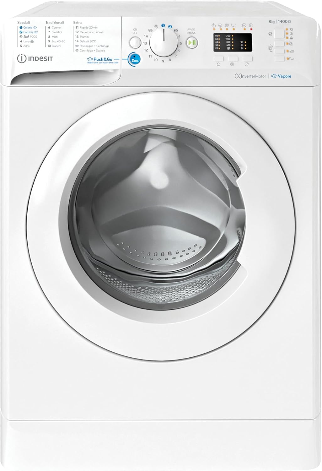 La Indesit BWA 81496X WV IT è una lavatrice a carica frontale da 8 kg a libera installazione, progettata per offrire prestazioni elevate, consumi ridotti (Classe A) e programmi intelligenti come Push & Go Vapore e Ciclo PODS. Con centrifuga fino a 1400 giri/min, assicura capi meno umidi e tempi di asciugatura ridotti.